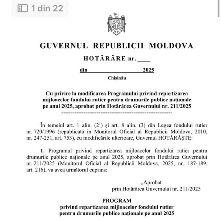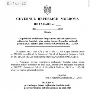 Prin Hotărârea Guvernului nr. 211/2025, au fost repartizate mijloacele fondului rutier pentru întreținerea drumurilor publice naționale în anul 2025.