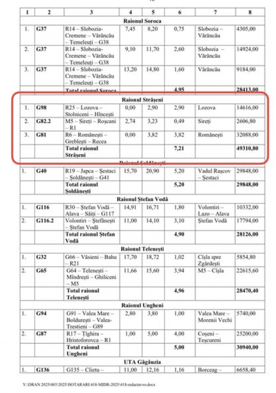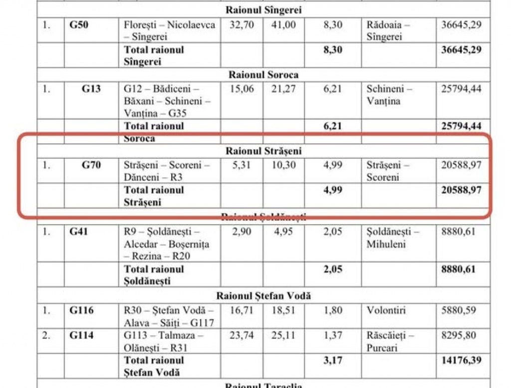 Pentru raionul Strășeni sunt prevăzute investiții importante în infrastructura rutieră, în valoare totală de 49,31 milioane lei, după cum urmează:
